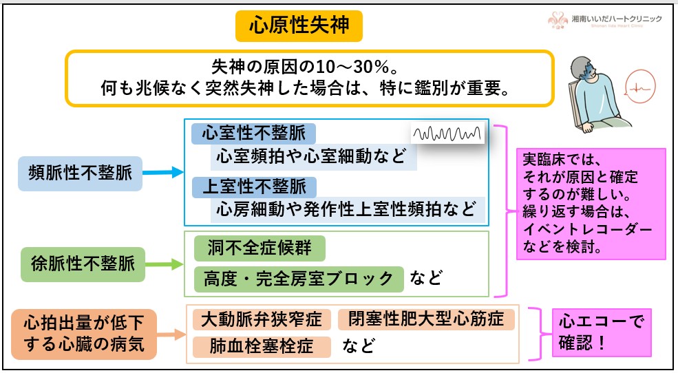 何も兆候がなく突然失神した場合は、心原性失神を疑います。