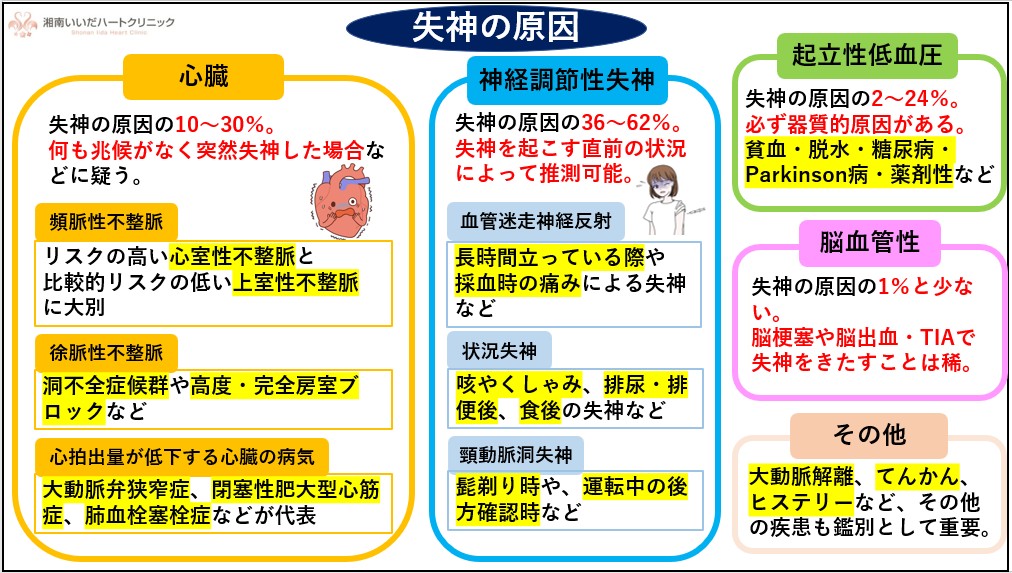 失神の原因は、A) 心臓の病気 B) 神経調節性失神 C) 起立性低血圧 D) 脳血管性 E) その他 の大きく5つに分類すると分かりやすいです。下にまとめてみましたので、まずはこちらを参考にしてみて下さい。