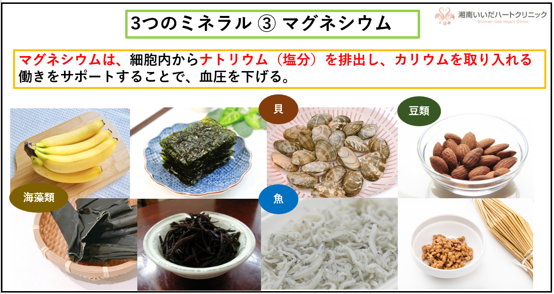 マグネシウムは、細胞内からナトリウム(塩分)を排出し、カリウムを取り入れる働きをサポートすることで、血圧を下げます。