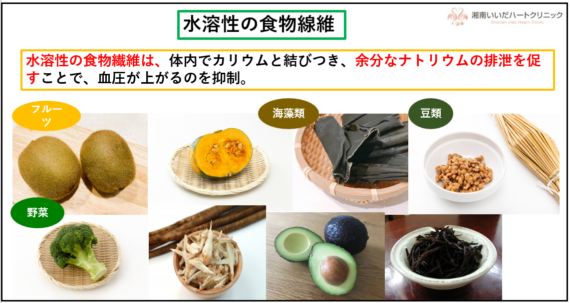 水溶性の食物繊維は、体内でカリウムと結びつき、余分なナトリウムの排泄を促すことで、血圧を下げます。